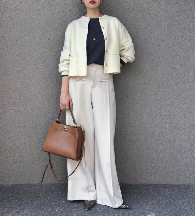 アイボリーのニットカーディガンを羽織り、同系色のワイドパンツを合わせたsakura.031358さんの上品なワントーンスタイル。カーディガンはゴールドのボタンがアクセントになっており、肉厚な生地感なのでジャケットのような感覚できちんと着こなせます。インナーにはネイビーを差し色として投入。上下を淡いトーンでまとめつつ、インナーの濃色で視線を中央に集めることで、膨張しがちな白系のコーディネートをすっきりと引き締めています。センタープレスの入ったパンツは、すとんと落ちるシルエットが美しく、脚長効果も期待できる一着。足元にはパイソン柄のパンプスを忍ばせ、シンプルな装いに程よいスパイスを加えているのがポイントです。