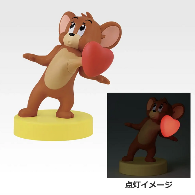 オンラインと店頭、両方で販売される今回のトムとジェリーの一番くじ。賞品は、約40cmのトムのくったりしたぬいぐるみや、ドキドキしてハートが飛び出すジェリーのライト。