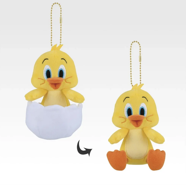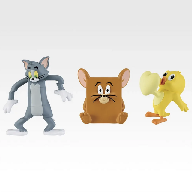 トム、ジェリー、タフィー、クアッカーのディスプレイぬいぐるみマスコットは、それぞれバケツ、チーズ、卵の殻といった台座付き。