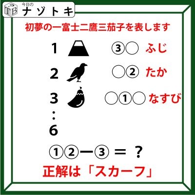 イラストからでもある程度推察はできますがこれらが何の括りか考えていきましょう。分かりましたでしょうか?それはいわゆる初夢でみると縁起がいいとされる6つのものです。とくに最初の3つが有名ですね。つまり、「1ふじ(富士)2たか(鷹)3なすび(茄子)」というやつですね。確かに丸の数とも一致します。