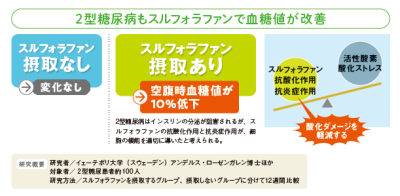 2017年に発表された、スウェーデンのイェーテボリ大学の研究では、2型糖尿病患者約100名を、スルフォラファンを摂取するグループと摂取しないグループに分け、12週間にわたって比較。結果、スルフォラファンを摂取したグループでは、摂取していないグループに比べて空腹時血糖値が10%も低くなることが分かりました。