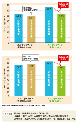 ALT、AST、γ-GPTの値が高い男性52人を対象にした研究で、スルフォラファンを2カ月間摂取した結果、ALT、γ-GTPの値が10%以上も改善したと報告されています。