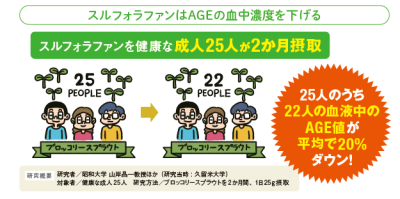 昭和大学(現在の昭和医科大学)の研究によると、スルフォラファンには、糖化の原因であるAGE濃度を下げる作用が明らかになっています。成人25人がスルフォラファンを高濃度に含むブロッコリースプラウトを2カ月間食べた研究では、25人のうち22人の血中AGE量が下がり、その低下率は平均で20%となりました。
