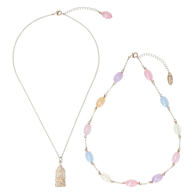 バーティー・ボッツの百味ビーンズのパッケージデザインを落とし込んだプレートネックレスと、色とりどりのビーンズを再現したポップなネックレスのセットアイテム。コーディネートに合わせて選んだり、重ね付けしたり、アジャスターで長さを変更したりと多様な楽しみ方ができる。友人やパートナーとおそろいで付けるのもおすすめだ。
