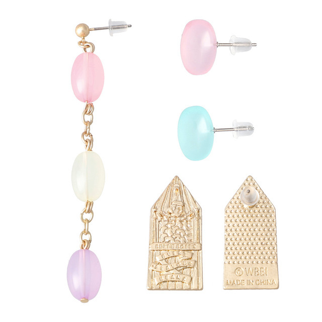バーティー・ボッツの百味ビーンズのパッケージデザインを落とし込んだプレートピアスや色とりどりのビーンズを再現したゆらゆら揺れる三連ピアス、つるっとした質感がかわいらしいグリーンとピンクの一粒ピアスとのセットアイテム。ゴールドのモチーフが印象的な百味ビーンズプレートピアスを使用したり、ポップな印象のビーンズを組み合わせたりと、気分やシーンに合わせて多様な楽しみ方ができる。
