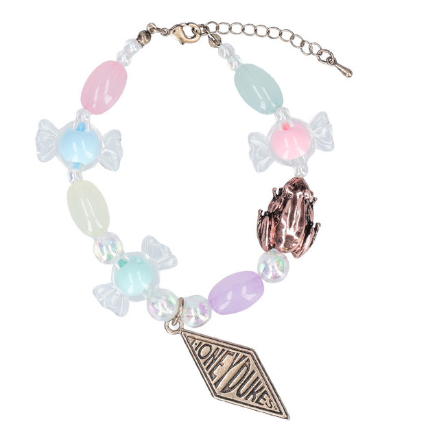 百味ビーンズやキャンディの形のビーズの、ハニーデュークスデザインのブレスレット。パステルカラーのビーズにプラスして、アクセントになる蛙チョコレートやハニーデュークスのメタルパーツをあしらった。同日発売のネックレスセットやピアスセットと合わせて着用するのもおすすめだ。