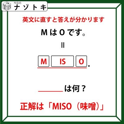 あとは答えを考えるためにこの英文を眺めてみましょう。ローマ字読みで単語になっていないでしょうか?そうです!「MISO(みそ)」です!英文が1つの単語を表していたわけですね。というわけで正解は「MISO(みそ)」でした。