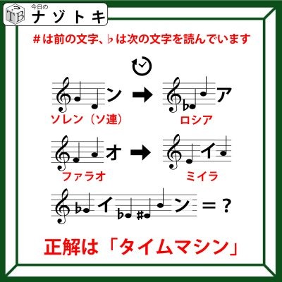 音階と記号の意味を考えるナゾトキでした。各音階の文字と、並んでいる文字を読むことで単語になります。なので例示の左側の読み方は「ソレン(ソ連)」「ファラオ」です。矢印は時間経過を表しており、「ソレン(ソ連)」は「ロシア」となり、「ファラオ」は「ミイラ」となっています。「レ」にくっついているはくっついた音階の文字の五十音での次の文字を読んでいます。あとは問題を解いていきましょう。問題にはもありますがが次の文字ならは一つ前の文字を読むことが推測できますね。そのことも踏まえて読んでいきましょう。正解は「タイムマシン」でした。