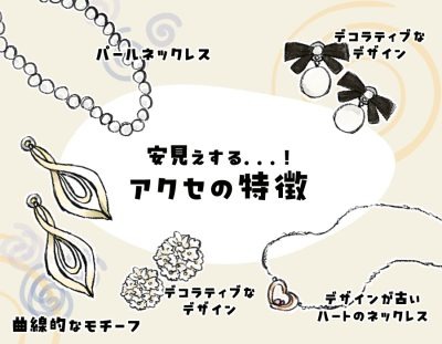 注意したいのが、凝ったデザインのアクセサリーと大ぶりタイプのアクセサリーです。そして、パールネックレスですね。凝ったデザインのアクセサリーは、とくにピアス・イヤリング・ノンホール系に多いのですが、ちょうちょやリボン、お花モチーフ系のアクセは、造りが精巧でないと高級感が出にくいもの。販売価格が数百円単位のアクセサリーでは、華やかさを与えるどころか子どもっぽさが際立ってしまうので気をつけたいところです。また、変形モチーフやフープ系などの大ぶりアクセは、アクセ面積が大きい分、作り込みの粗さもパッと見で目立ちやすい傾向にあります。それであれば、小さくてシンプルなアクセサリーを選ぶ方が良さそうです。