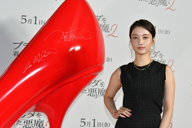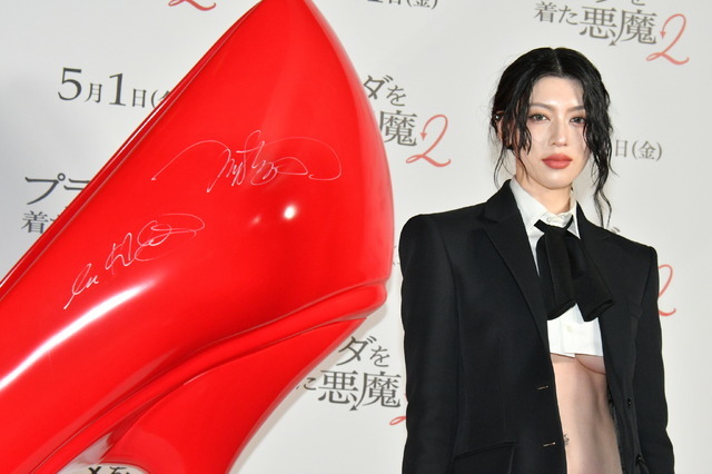 背中の大きなリボンが印象的なスーツを纏った三吉彩花は「『プラダを着た悪魔』は、いつも自分の人生を初心に帰らせてくれるような作品。社会の中でどうやって生きていくか、自分は何が好きなのか、どのように人間関係を構築していったら良いんだろうという人間性も学べるところが好き。新しいキャストの方々もたくさん出られているので、皆さんの関係性やファッションを観られるのも楽しみです」と話した。