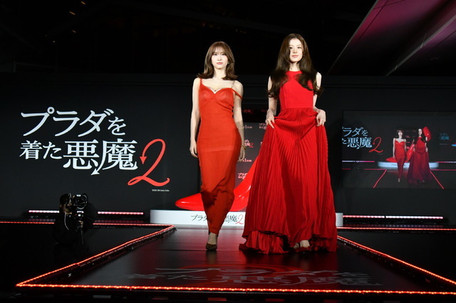 MOMOとSANAは、「自信、スタイル、そして圧倒的な存在感を体現する、まさにこの作品を体現する2人の女性」と紹介された。今をときめくファッションアイコンとして、世界で活躍している彼女たちは今回、作品のテーマカラーである赤のゴージャスな衣装で全身ドレスアップ。この日のために作られたスペシャルステージのランウェイを堂々と歩き、一瞬にして会場中を魅了した。