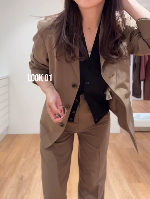 足元にはヒールのあるブーツを合わせて、マニッシュなセットアップに程よい緊張感を与えています。眼鏡やゴールドのイヤリングといった小物使いも、顔周りに華やかさを添えるポイント。生地の質感が際立つアイテム選びで、シンプルながらもしっかりと存在感のあるスタイルに仕上がっています。