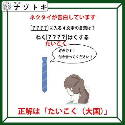 イラストの状況を文にして当てはまる言葉を考えるナゾトキでした。イラストはネクタイが女性に対して何かいっています。なんとネクタイが女性に対して「好きです。付き合って下さい!」と言っているようです。つまり、告白をしているのですね。まとめるとネクタイが告白しているのですね。ここまでくれば当てはまる言葉がわかりますね。そうです!「たいこく(大国)」です!文にすると「ネクタイこくはくする」となります。正解は「たいこく(大国)」でした。