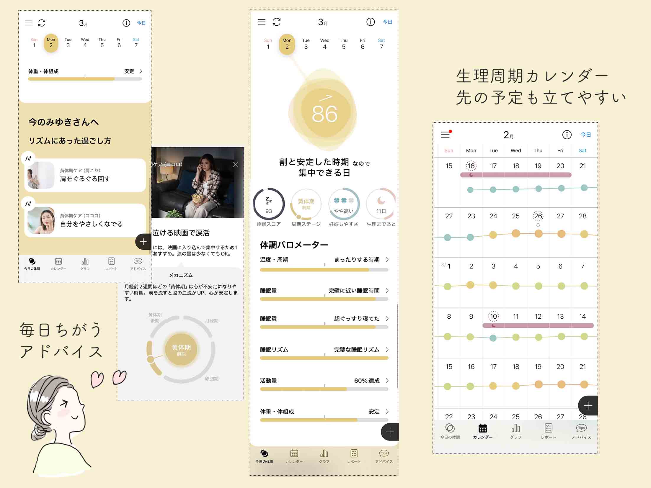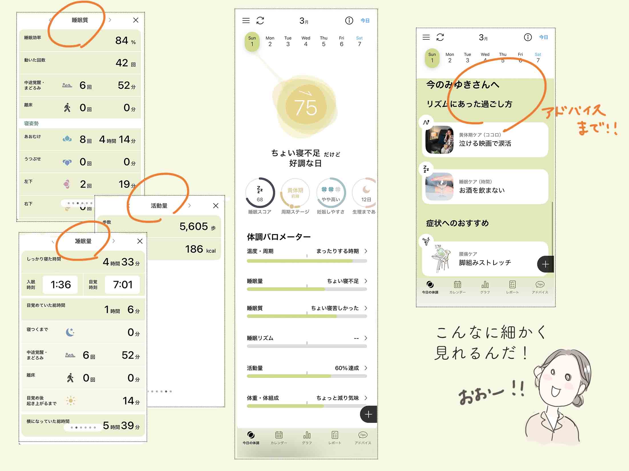 さらに、その日の状態に合わせたアドバイスが届くのもよくて、「どう過ごせばいいのか」がわかる点は、今までとの違いだと感じました。