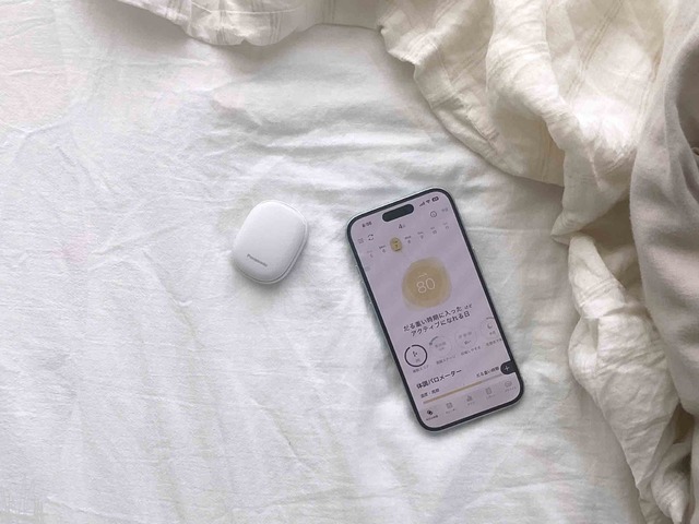 使い方もとても簡単。電源を入れて、寝る前にパジャマのズボンに挟んで寝るだけ。朝起きたらボタンを押して、スマホにデータを転送します。私は枕元に置いて使っていました。小さくて軽いので、つけている違和感はほとんどなし。まずはしばらく、日々の変化を見てみることにしました。