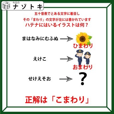 そうです、「ひ」の周りの文字だから右のイラストが「ひまわり」なんですね。それでは同じように考えてみましょう。「えけこ」は「お」の「まわり」にあるから「おまわり」ということになります。よってあとは問題を考えてみましょう。「せけえそお」は「こ」のまわりにある文字列です。というわけで正解は「こまわり」でした。