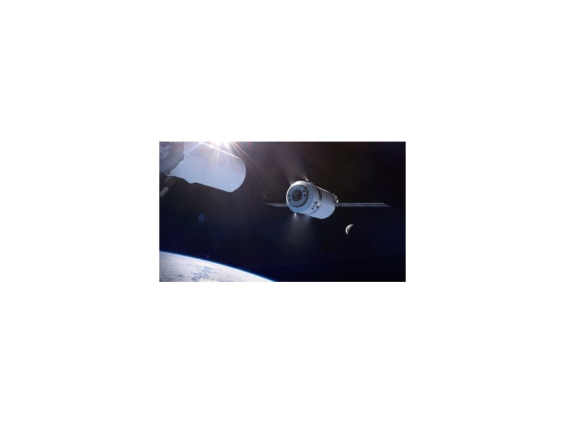 ロケット(左)から切り離され、月を周回するゲートウエーに向けて物資を運ぶ宇宙船ドラゴンXL(中央)の想像図(スペースX提供・共同)