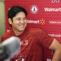 試合後、取材に応じるエンゼルスの大谷翔平=5日、オークランド(共同)