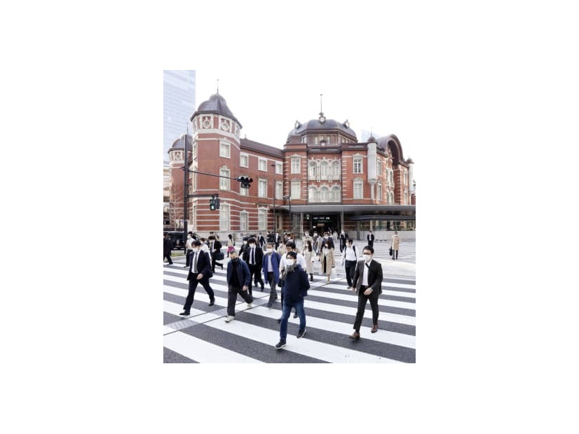 マスク姿で通勤する人たち=2020年4月、東京・丸の内